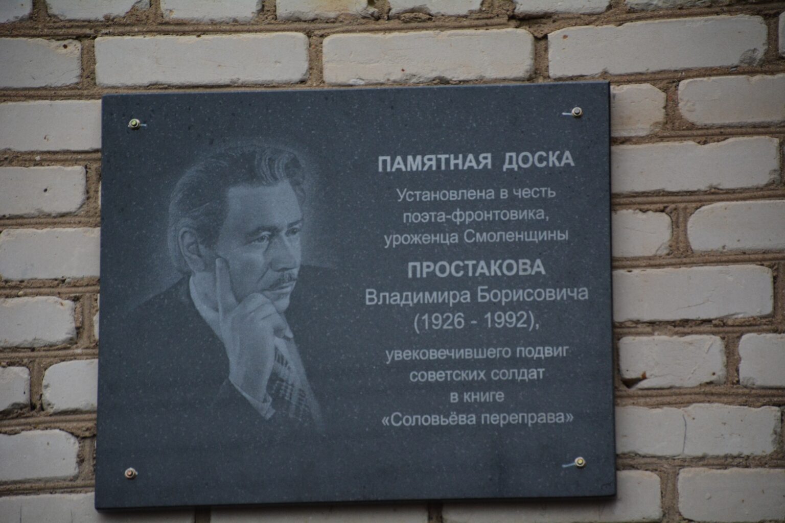 Владимир Борисович уроженец деревни Титково Кардымовского района, но в его творчестве особое место занимала Соловьева переправа. Неслучайно на памятной доске указано, что она установлена в честь поэта-фронтовика, уроженца Смоленщины Простакова Владимира Борисовича (1926-1992), увековечившего подвиг советских солдат в книге «Соловьева переправа».